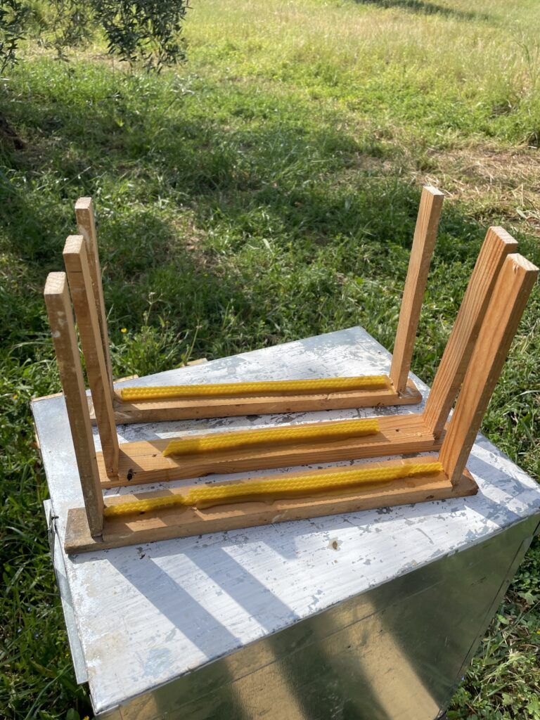 Te dejo algunas fotos de los cuadros Layens adaptados y con unas tiras iniciadoras. El motivo de esta preparación y por qué voy a probar usando Layens en vez de Langstroth (que es la colmena que uso ahora) te la cuento otro día. No es la primera vez que lo intento, y como la vez anterior no funcionó pues ahora pruebo otra cosa. Te lo cuento en otra nota rápida el próximo día.